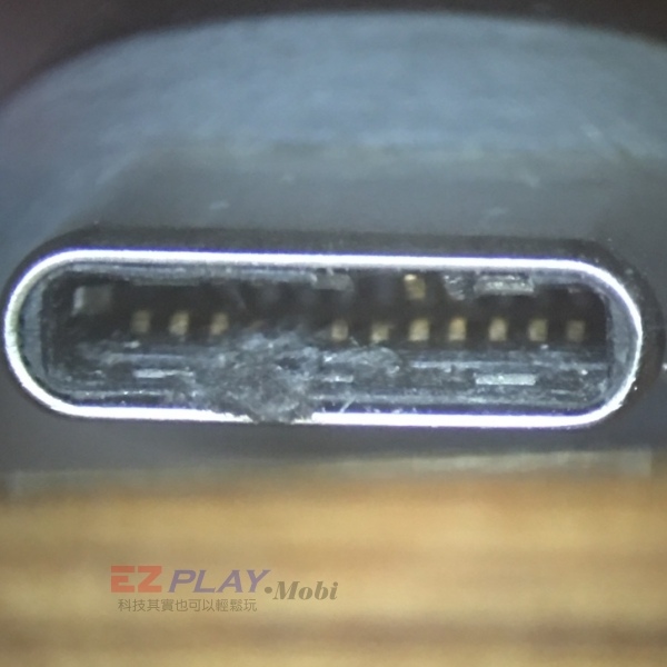 我們請小劉提供給我們當時對HTC U11 充電時發生燒焦異味的原廠充電線,經過我們放大數倍檢視這條原廠充電線,就如同照片上所示USB Type-C的充電線上接腳已經有幾支接腳被燒的焦黑,而接腳週圍的黑色塑料也因為高溫而有熔化的現象,可見當時接腳內部應該是有短路而造成接點燒毀而無法充電,但這樣的問題應該是換條充電線就應該就能充電,為何連續換了幾條線還是不能充電呢?
